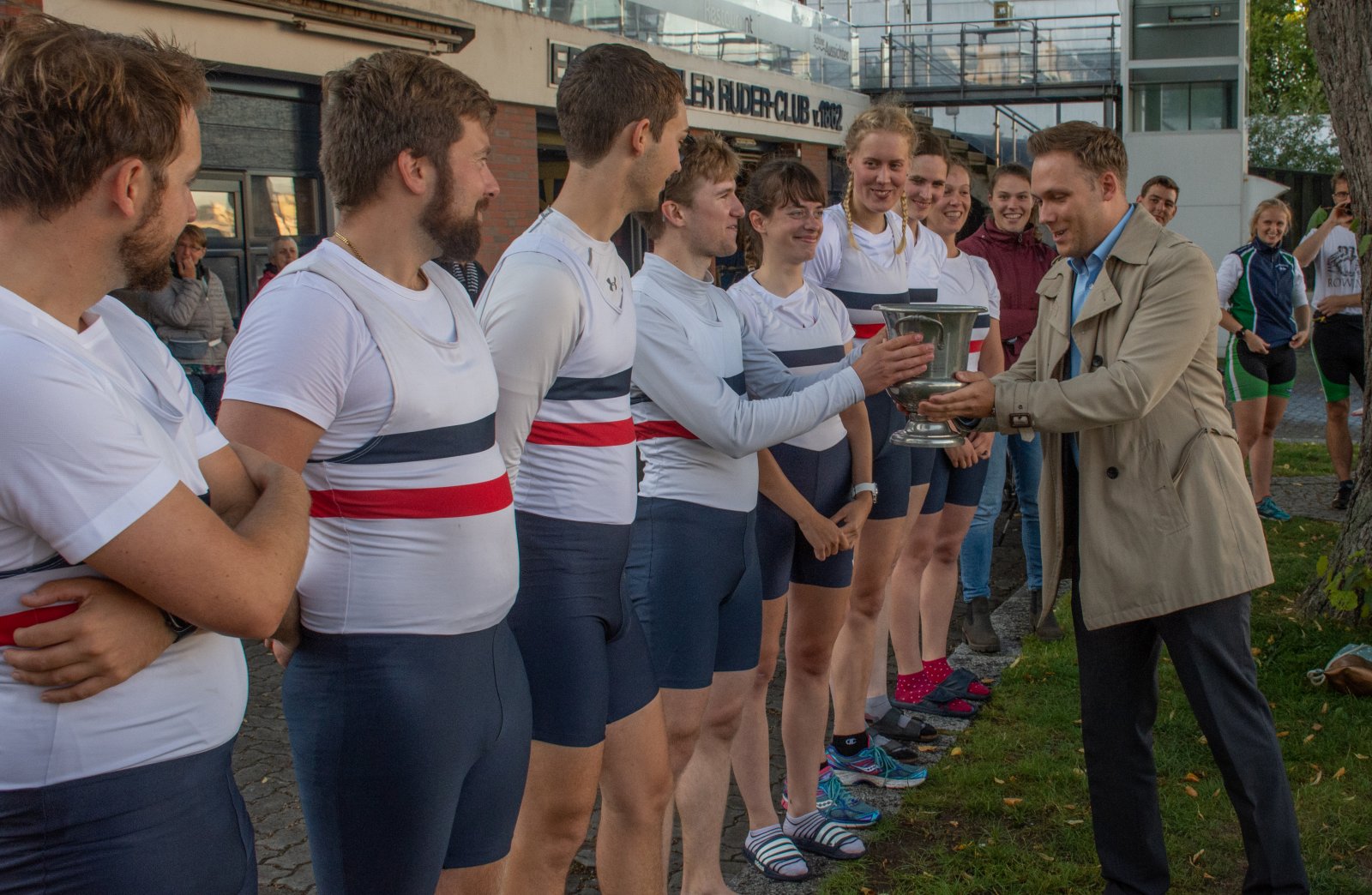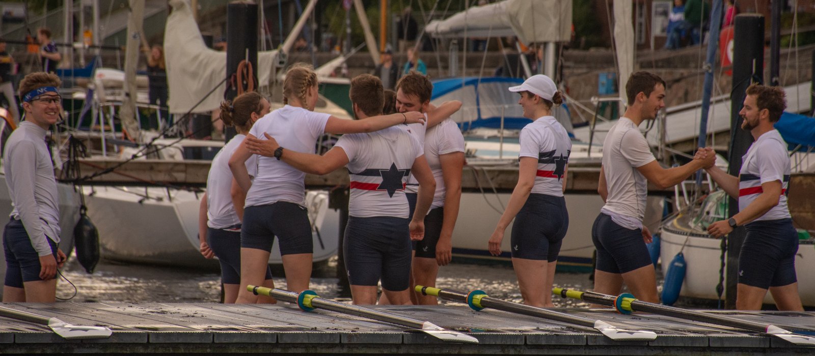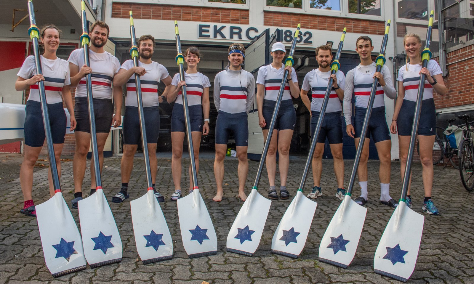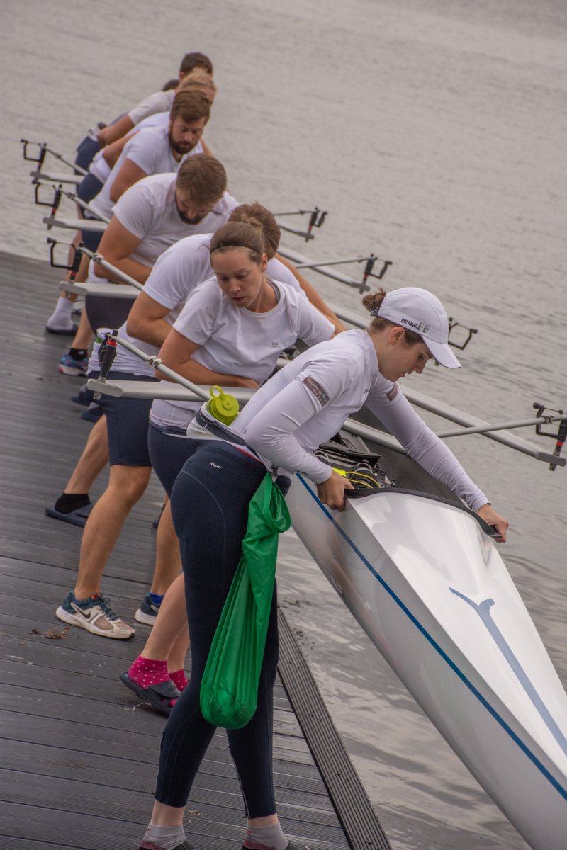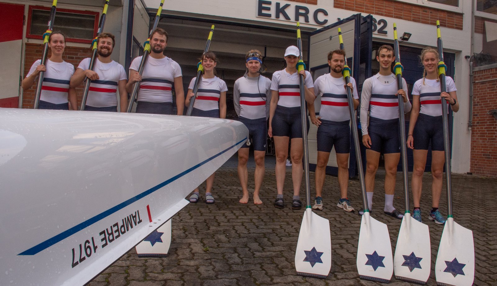 Die Mannschaft hatte sich bald gefunden: Inken Töwe (Bug), Leslie Matthiesen, Tim Piesch, Arne Möller, Frederik Enger, Jan-Phillip Schmidt, Mona Flathmann, Maj Seifert (Schlag) und Felix Eckel (Stm). Eigentlich war im Bug Anna Brinkmann eingeplant. Doch vor dem Start gab es Uneinigkeit über die Einstufung von Annas Teilnahme an einer Ergo-Regatta im Januar, da nach den Statuten ja nur ‚Freizeitruderer‘ am Stadtachter teilnehmen dürfen. Um lange Auseinandersetzungen zu vermeiden, trat Anna zurück und Inken nahm ihren Platz ein.