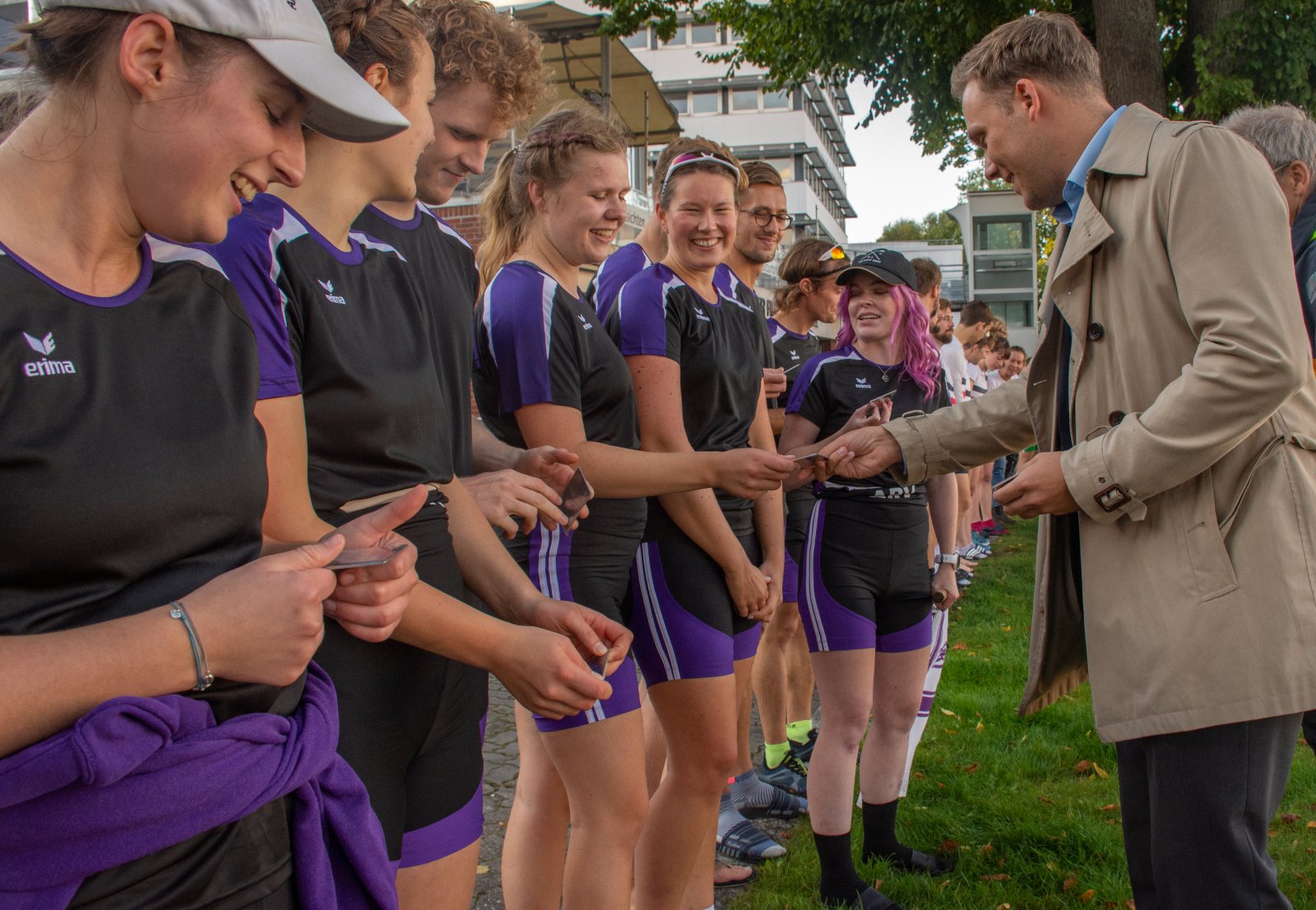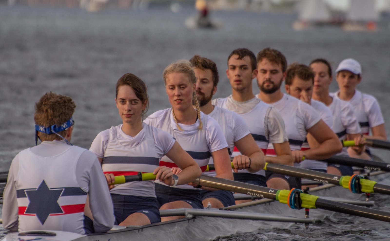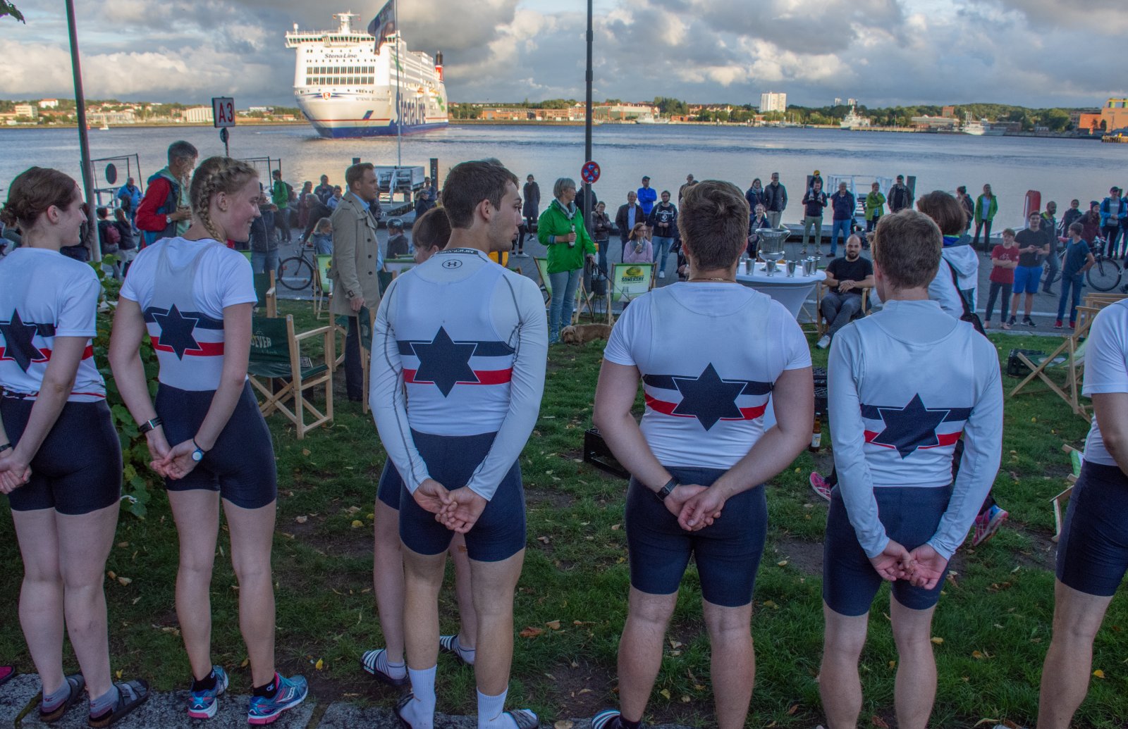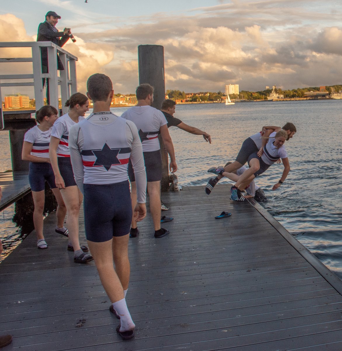 Die Mannschaft hatte sich bald gefunden: Inken Töwe (Bug), Leslie Matthiesen, Tim Piesch, Arne Möller, Frederik Enger, Jan-Phillip Schmidt, Mona Flathmann, Maj Seifert (Schlag) und Felix Eckel (Stm). Eigentlich war im Bug Anna Brinkmann eingeplant. Doch vor dem Start gab es Uneinigkeit über die Einstufung von Annas Teilnahme an einer Ergo-Regatta im Januar, da nach den Statuten ja nur ‚Freizeitruderer‘ am Stadtachter teilnehmen dürfen. Um lange Auseinandersetzungen zu vermeiden, trat Anna zurück und Inken nahm ihren Platz ein.