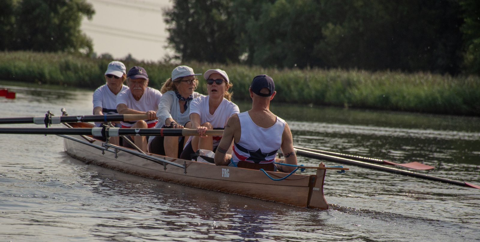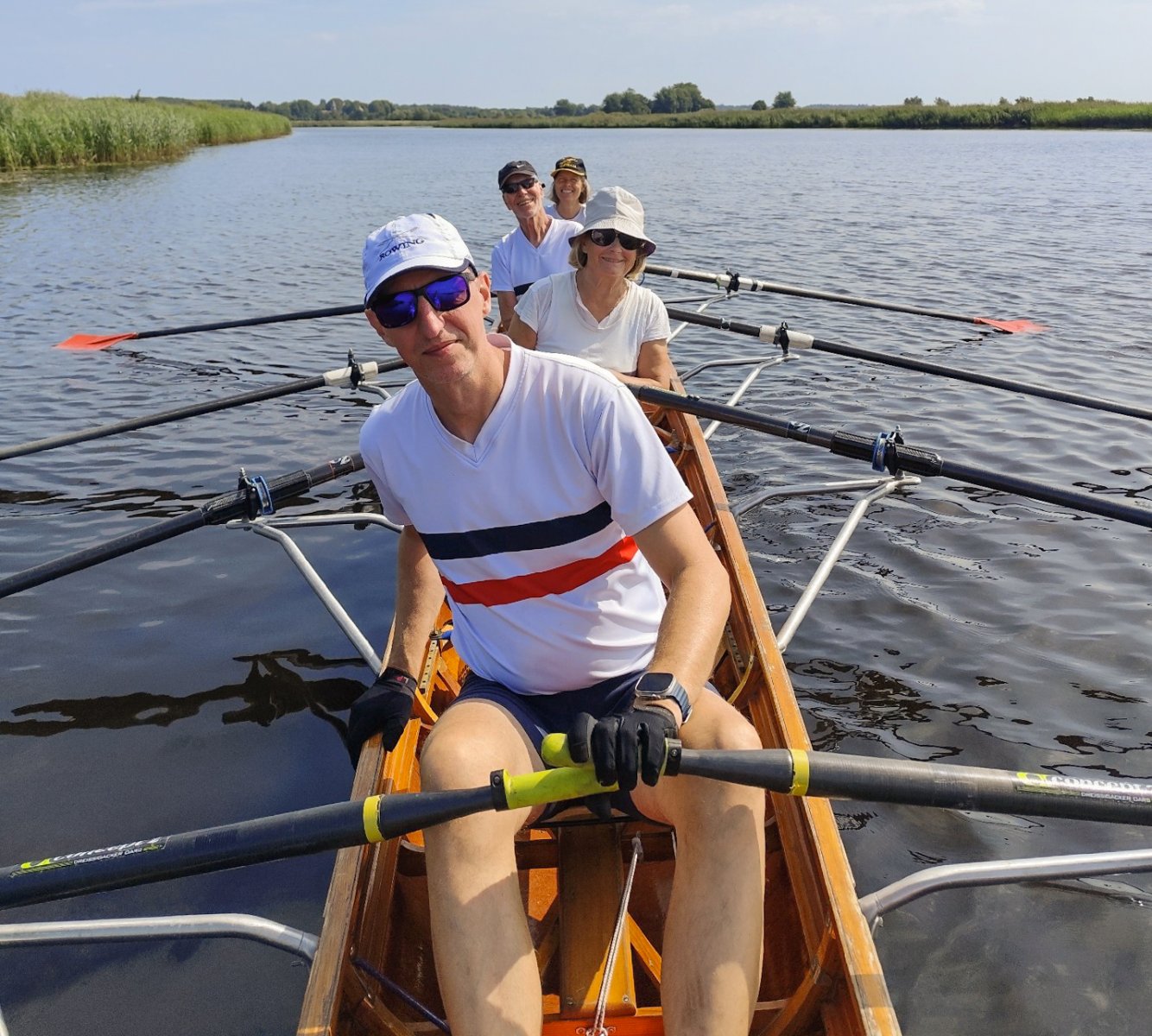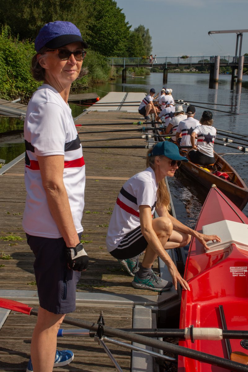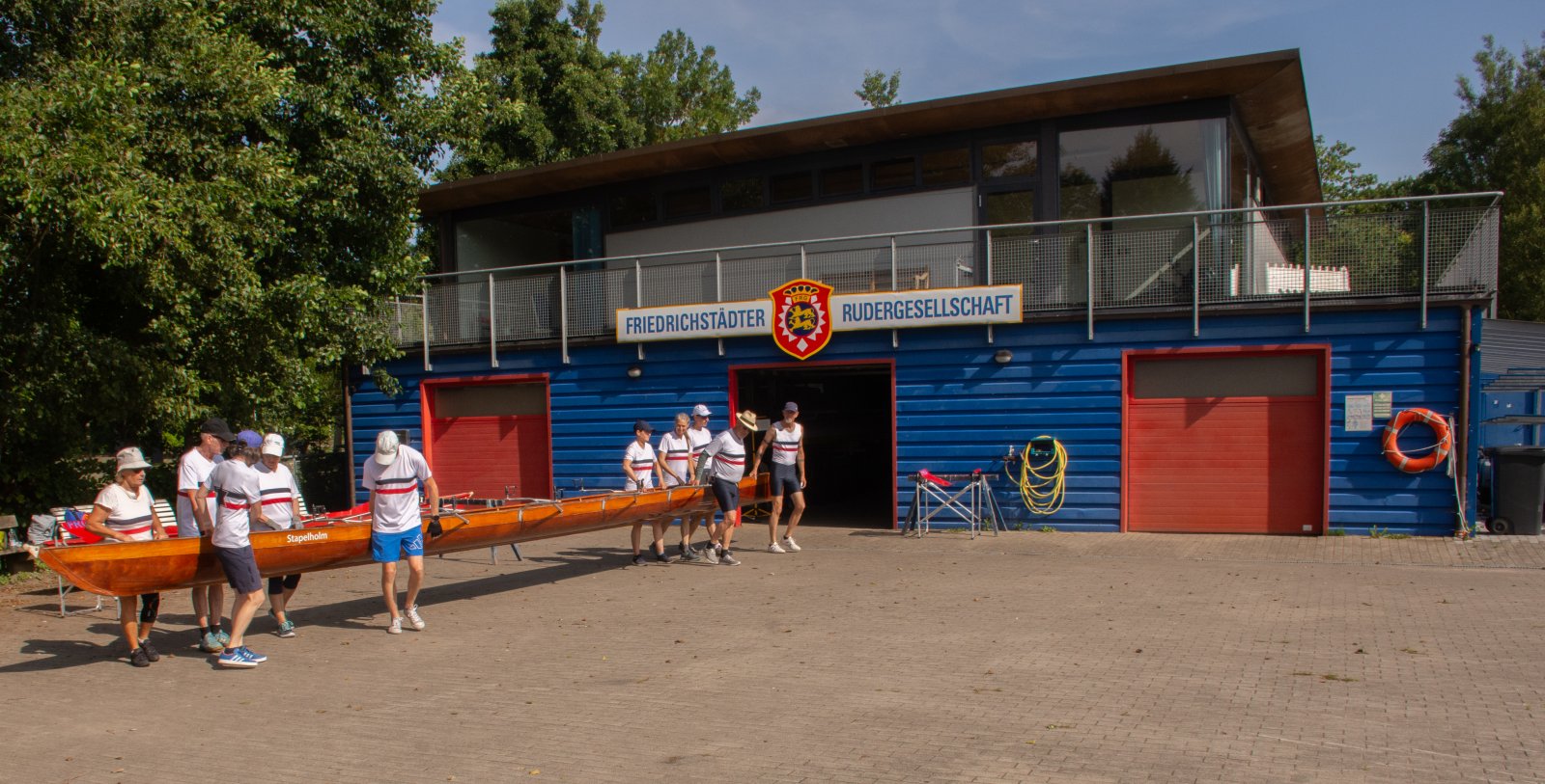 Wir sind zu Gast bei der Friedrichstädter Rudergesellschaft (FRG). Im Vorfeld gibt Claus die verfügbaren Bootsplätze bekannt. Die Liste enthält zwei Riemenboote, darunter einen Zweier. Insbesondere Letzterer sorgt für schlaflose Nächte bei einigen Teilnehmern: „Ich bin doch noch nie Riemen gerudert!“