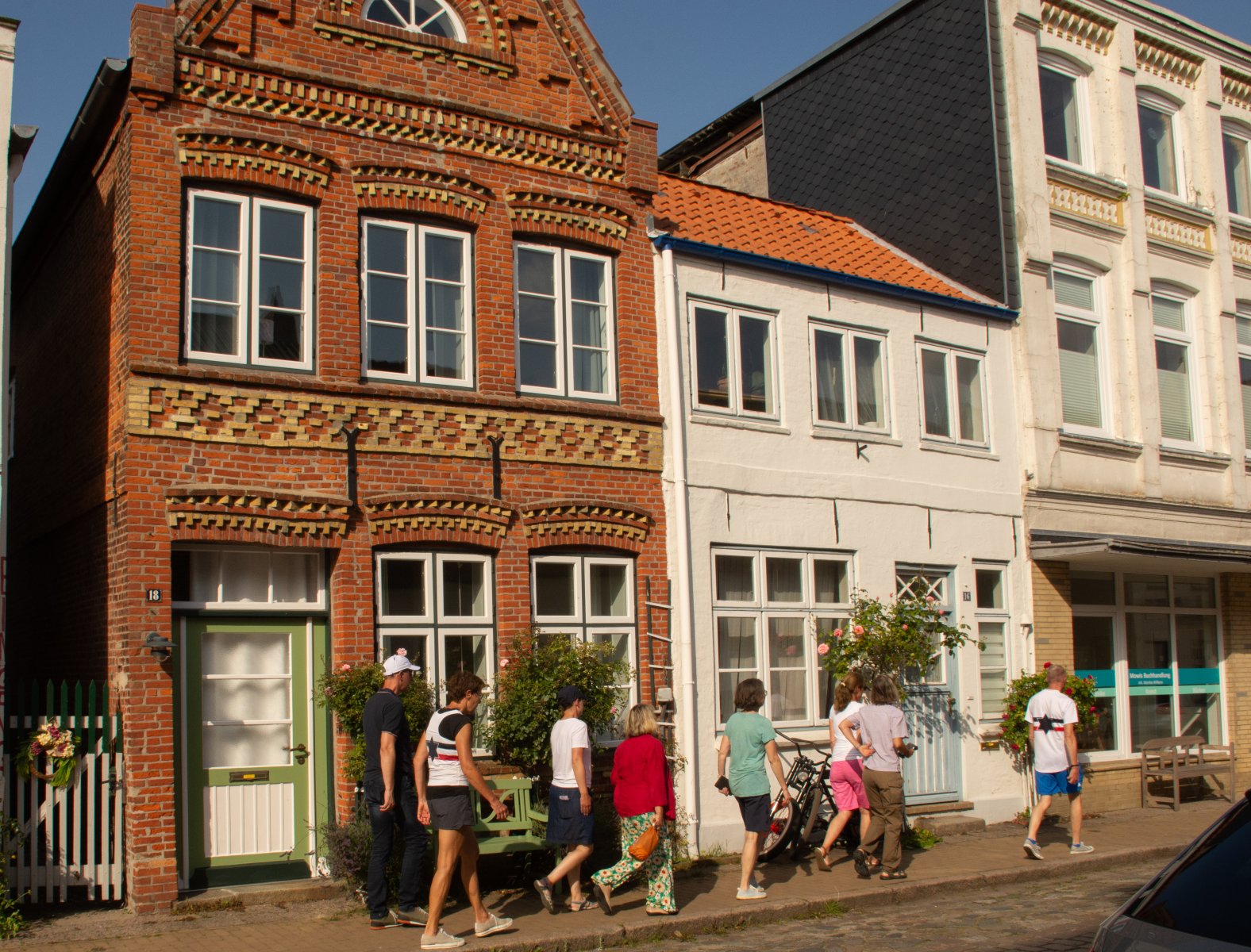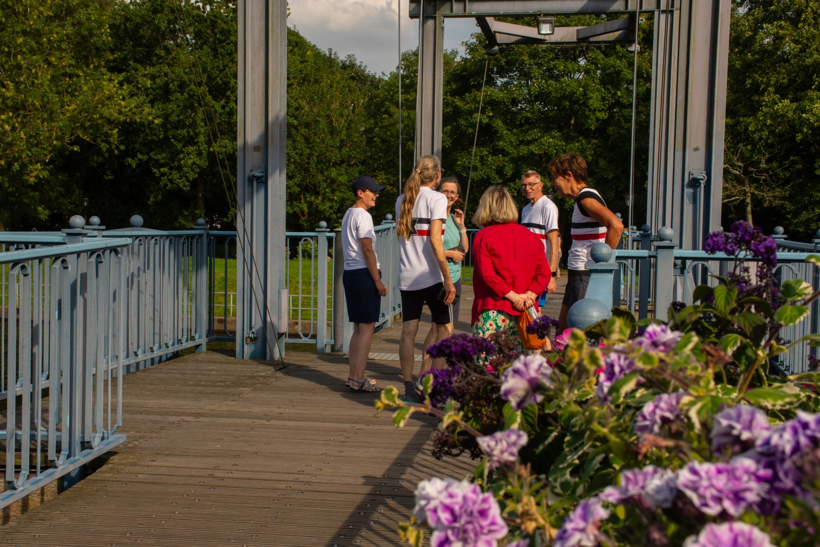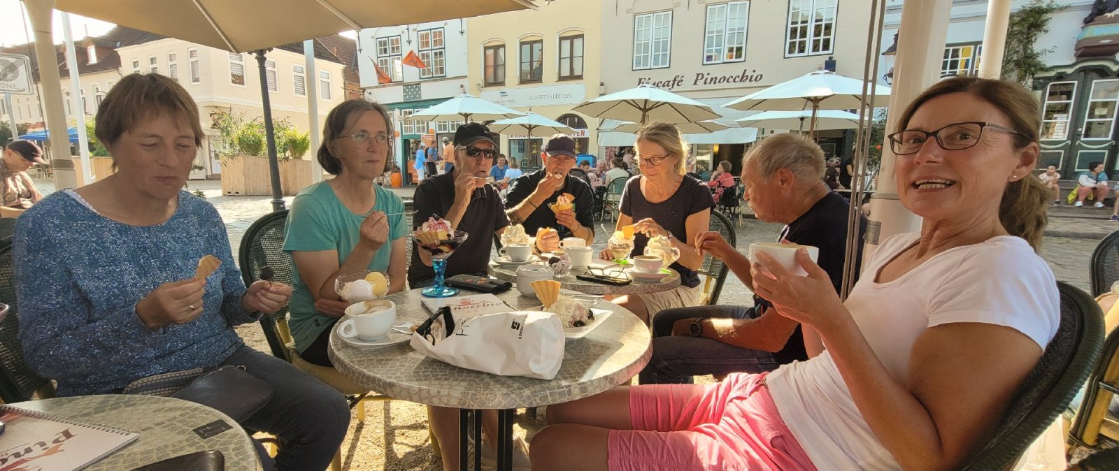 Zurück an Land der Beschluss, sich noch einmal die Beine zu vertreten. Also ab über die Holländisch inspirierte Fußgänger-Klappbrücke auf zum Marktplatz. In der ersten Eisdiele zur Rekonvaleszenz-Eisbecher. Die Größe der Pokale richtet sich nach den gefühlten Strapazen des zurückliegenden Tages und so gehen die Portionen in Familiengröße nur so über den Tisch. Und bei den Unersättlichen – oder sind es die Unentschlossenen? – zum Nachtisch noch eine Kugel auf die Hand.
