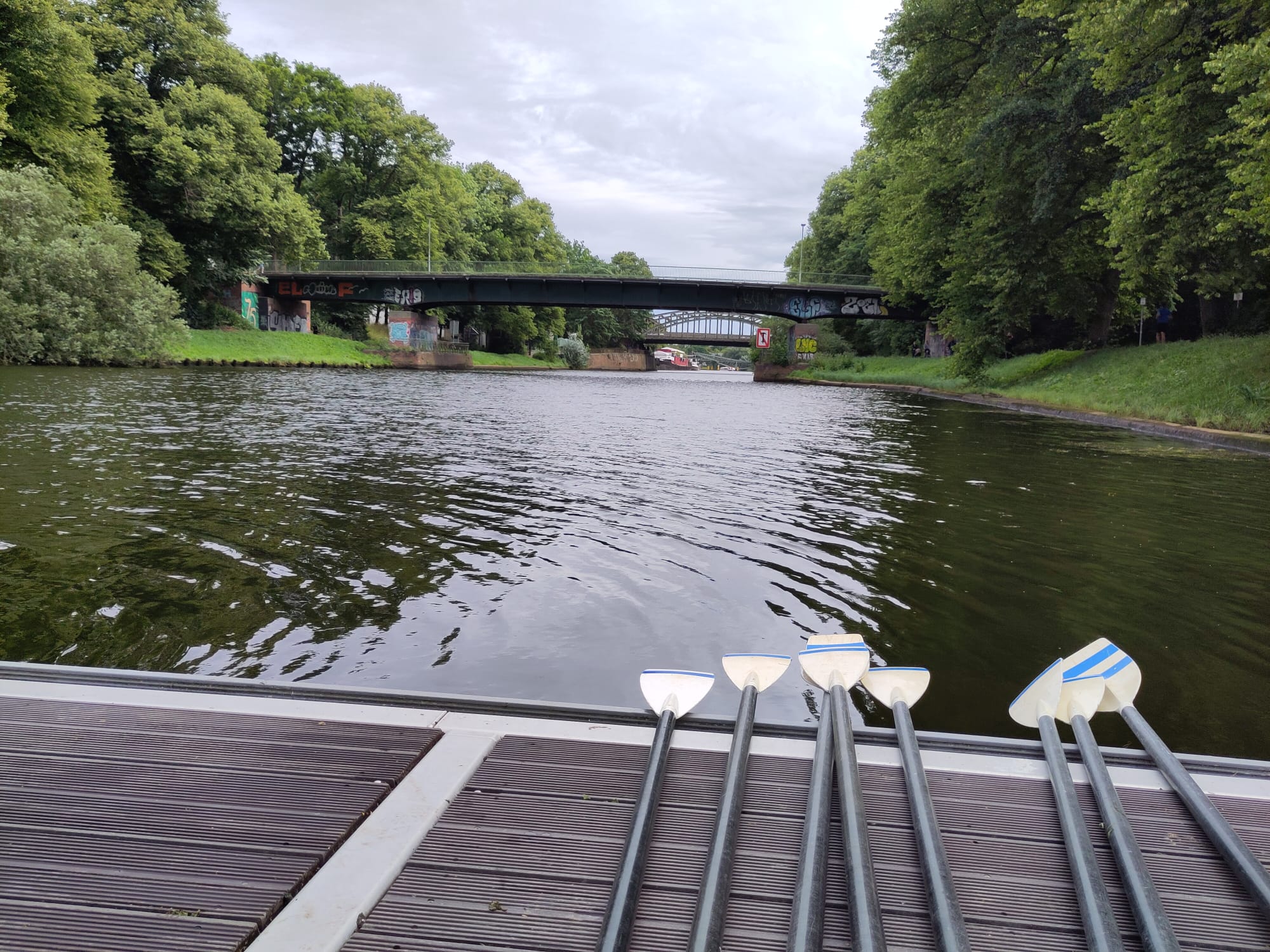 Nach einer gefühlten Ewigkeit kommen wir bei der Lübecker Rudergesellschaft am Steg an. Kurz vor dem Anlegen begegnet uns eines der anderen Boote. Die Ruderkolleginnen haben in der Zwischenzeit schon mal noch zusätzlich die ca. 4 km Besichtigungsrundtour durch die Lübecker Altstadt absolviert und wollen jetzt wohl just for fun noch etwas weiterrudern.