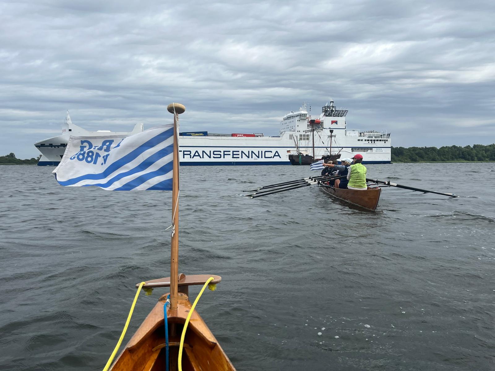 Als es Zeit wird aufzubrechen, ergibt es sich, dass wir mit der Priwall als letzte, aber zunächst noch frohen Mutes, den sicheren Hafen verlassen – um ernüchtert festzustellen, dass sich das Wasser innerhalb der Bucht zwischenzeitlich in einen Hexenkessel verwandelt hat! Fieser Wind und Strömungen drücken unser Boot ständig nach Steuerbord. Obwohl das Steuer ganz nach Backbord eingeschlagen ist und wir Steuerbord überziehen, ist dem kaum beizukommen, so dass wir immer wieder halten und wenden müssen. Dann eine weitere Herausforderung: Ausgerechnet in dieser ohnehin schwierigen Lage bekommt eine unserer Ruderkameradinnen einen Krampf im Bein. „Lass die Skulls los! Mach Ruder lang! Die drei anderen rudern weiter!“. In solchen Situationen zahlen sich die Tricks aus, die man mit der Zeit bei unseren erfahrenen und umsichtigen EKRC-Ausbildern gelernt hat.