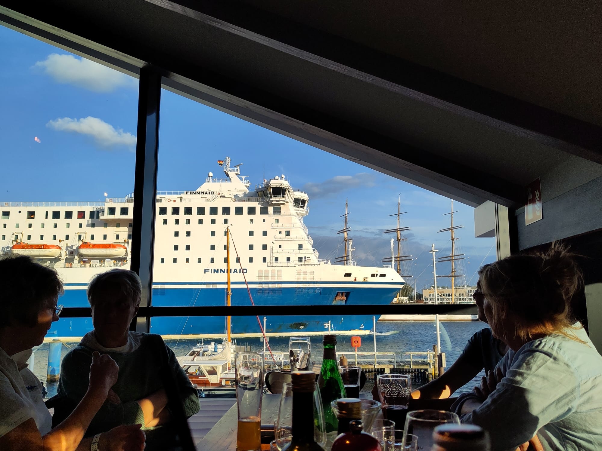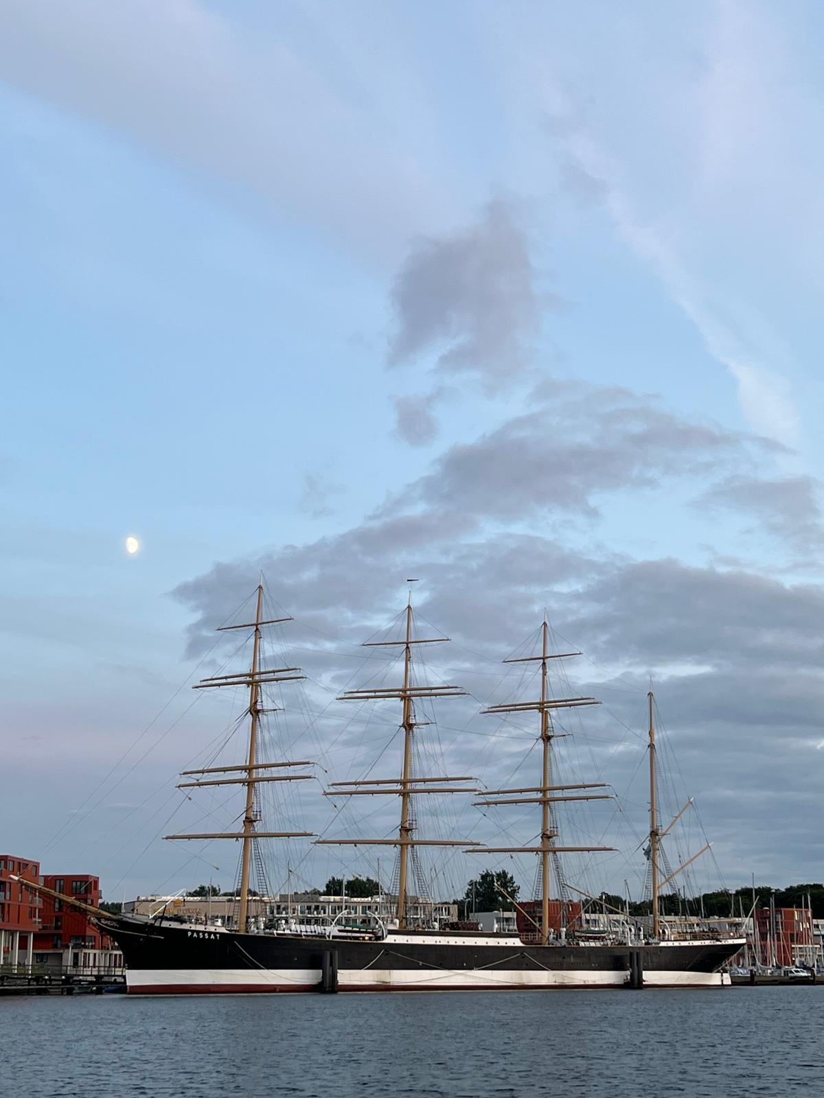 Ausgeruht und erfrischt, brechen wir gegen 18.30 Uhr gemeinsam auf. Entspannt spazieren wir die ca. 2km zum Fähranleger. Bei der Überfahrt vom Priwall nach Travemünde genießen wir den Blick auf das Städtchen. Unter anderem ist auch das elegante 4-Mast-Segelschiff „Passat“ von 1911, das dauerhaft vor dem Priwall liegt, ein echter Hingucker.