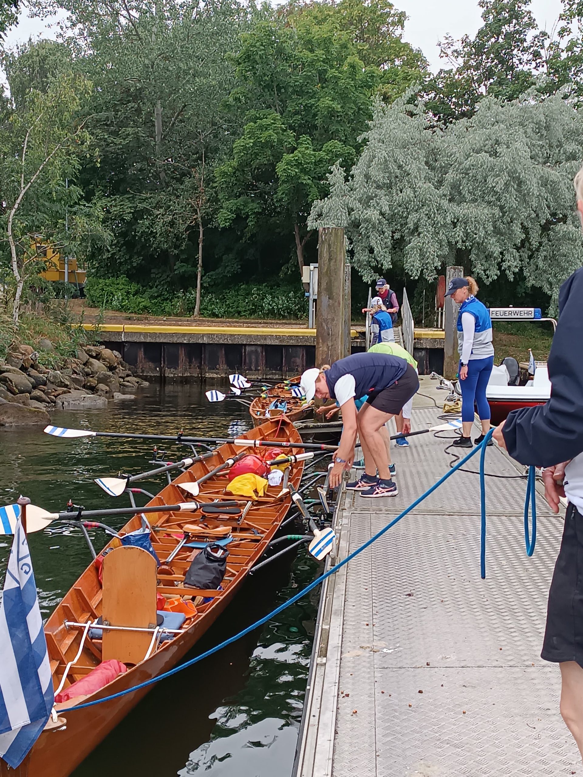 Engagiert wuselt Andrea über den Platz, hilft mit, teilt zu, beantwortet Fragen. Da am selben Tag eine interne Vereinsregatta stattfindet, müssen wir zum Ablegen bestimmte Zeitfenster beachten, was aber auch gut klappt. Hintereinander weg lassen wir die folgenden Boote zu Wasser: