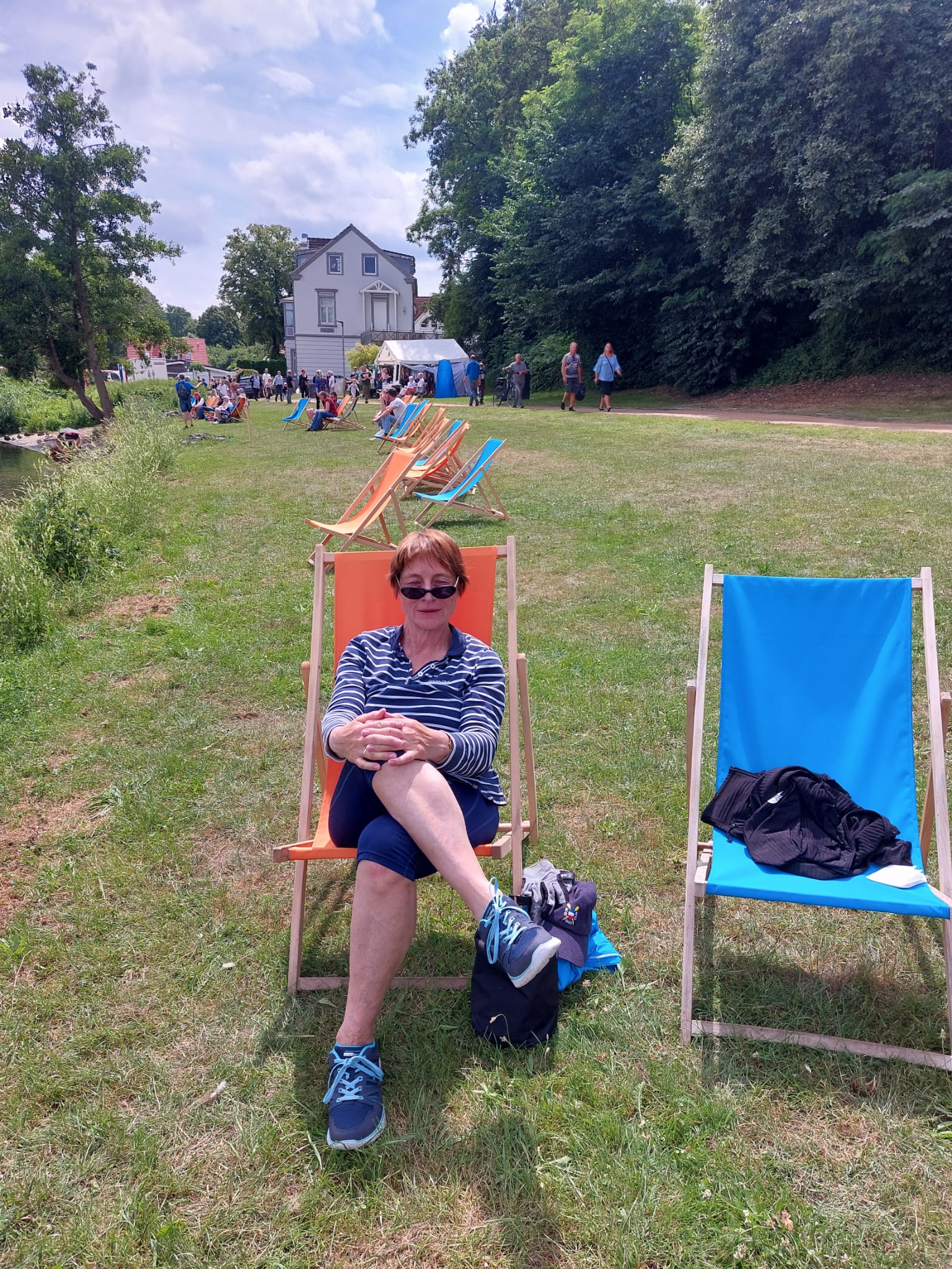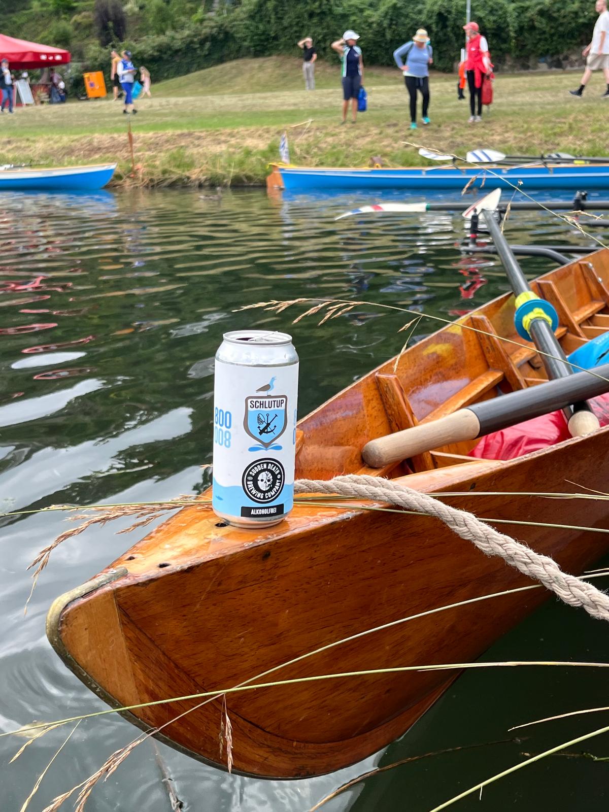 Anlässlich dieses Jubiläums findet ein Volksfest statt mit vielen Buden, Musik und Aktionen. Direkt am Ufer stehen zahlreiche Liegestühle bereit, die wir direkt mal in Beschlag nehmen. Hier machen wir nun unsere Mittagspause. Wer möchte, versorgt sich an den Ständen mit Speisen und Getränken. Es gibt sogar ein Jubiläumsbier: „Schlutup alkoholfrei“ von der „Sudden Death Brewing Company“. Na, dann: Prost!