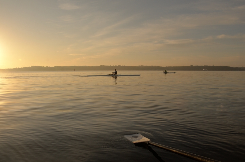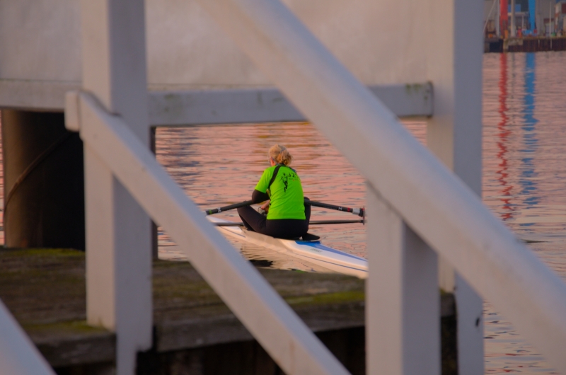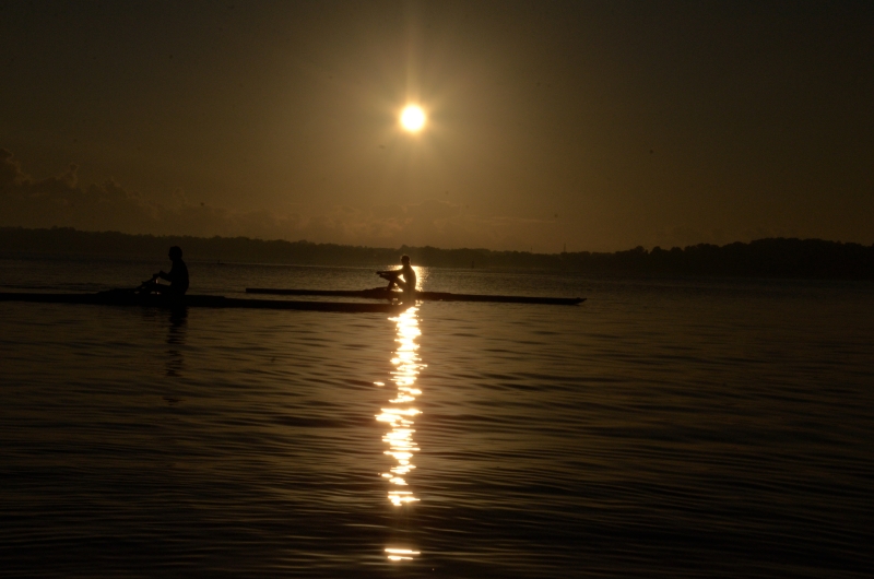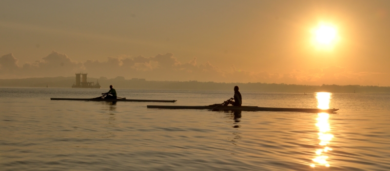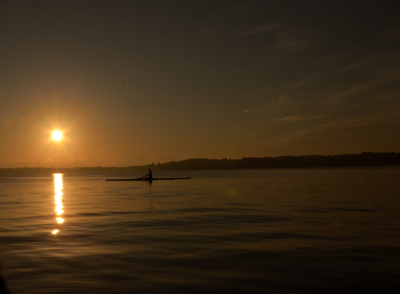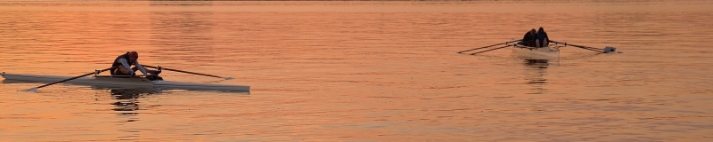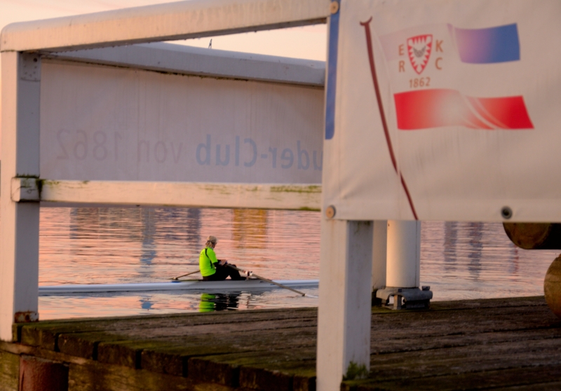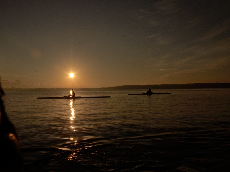 Doch nun ist er noch einmal zurückgekehrt und hat noch einmal eine Reihe von Frühaufstehern aus dem Bett gelockt, um den Early-Bird in seine offizielle Winterpause zu schicken. In vier kleinen Booten fahren wir zu siebt noch einmal in Richtung Schleusen und gleiten wir wieder über perfektes Early-Bird- Wasser der am wolkenlosen Himmel aufgehenden Sonne entgegen.