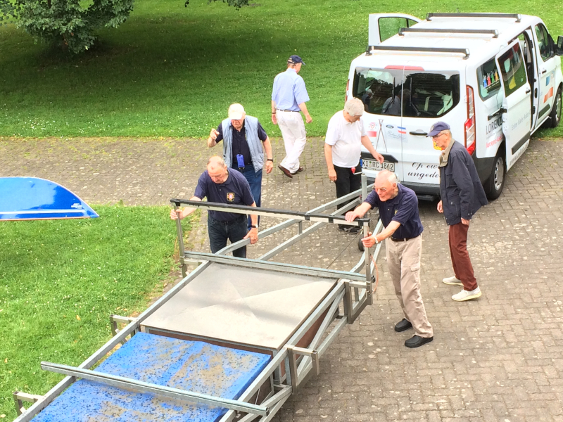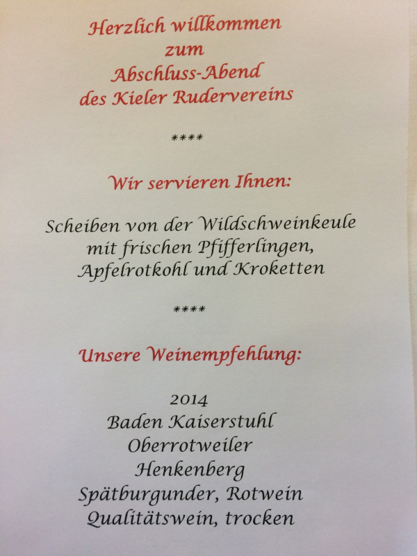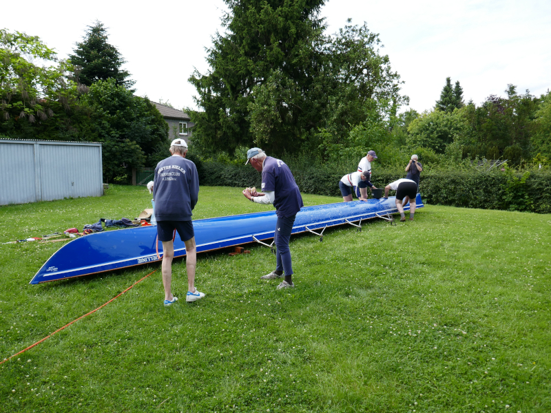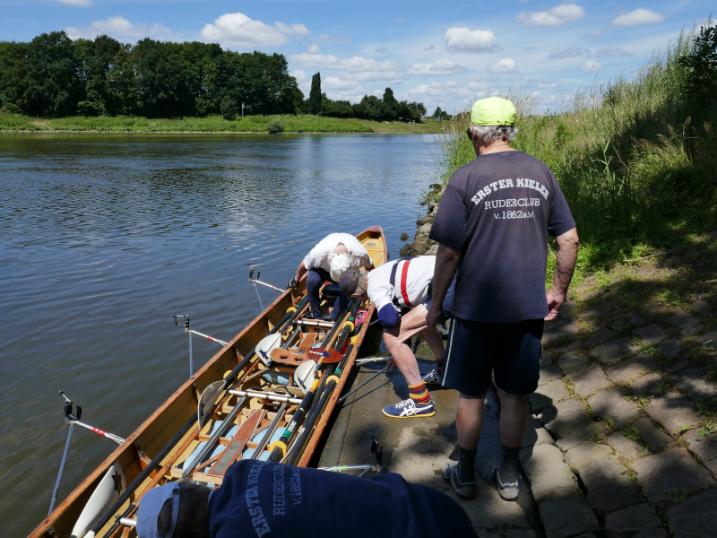 Und dann waren wir da, im Ruderclub in Stolzenau, unserem Ziel. Mit viel Eifer, Seife und Wasser wurde unsere Kiellinie gereinigt und das Material verstaut. Ein besonderes Abschiedsessen, mit Wildschweinkeule, Apfelrotkohl, Pfifferlingen und allem was dazu gehört, stand bereit, sogar schwach alkoholische Getränke wurden gereicht.