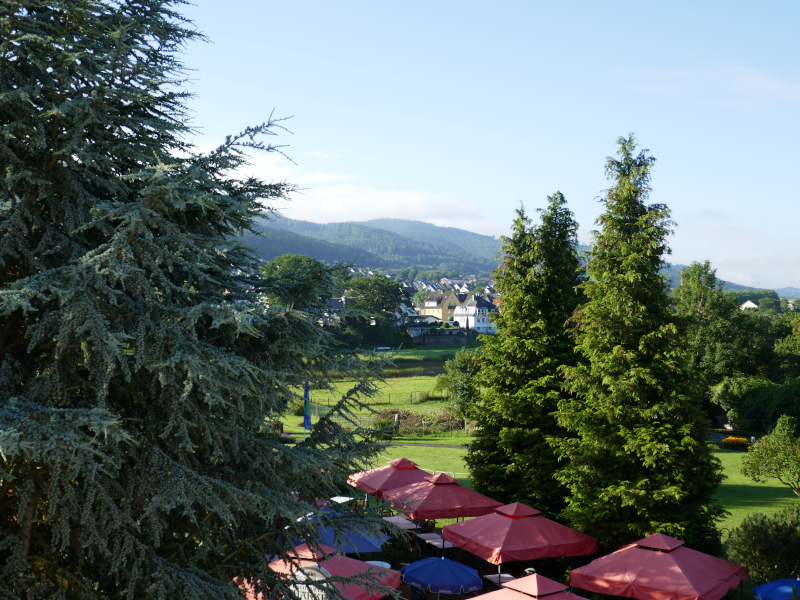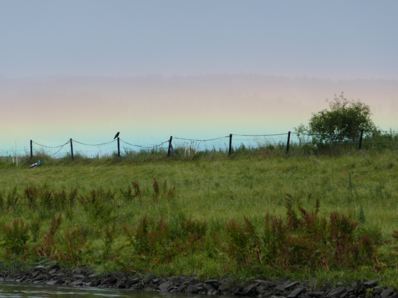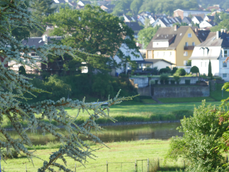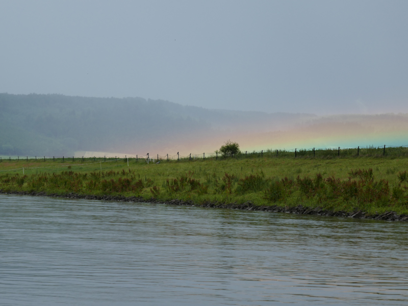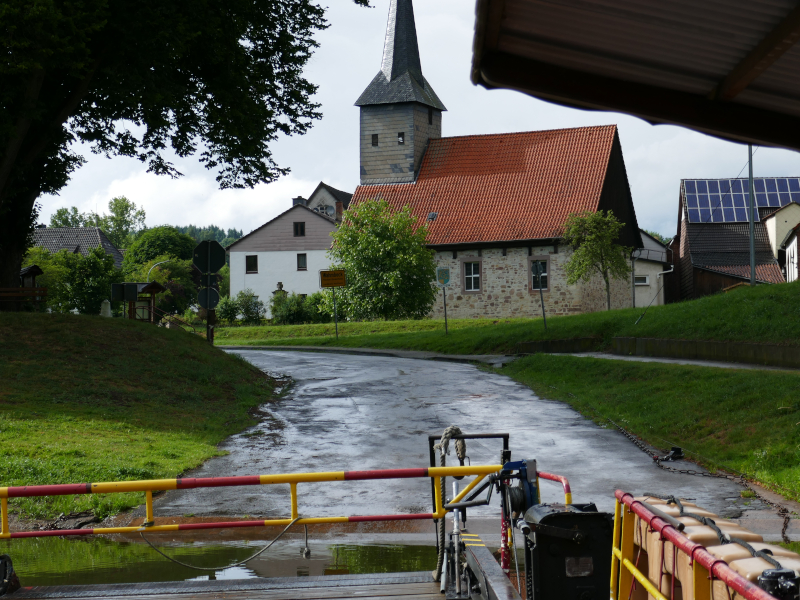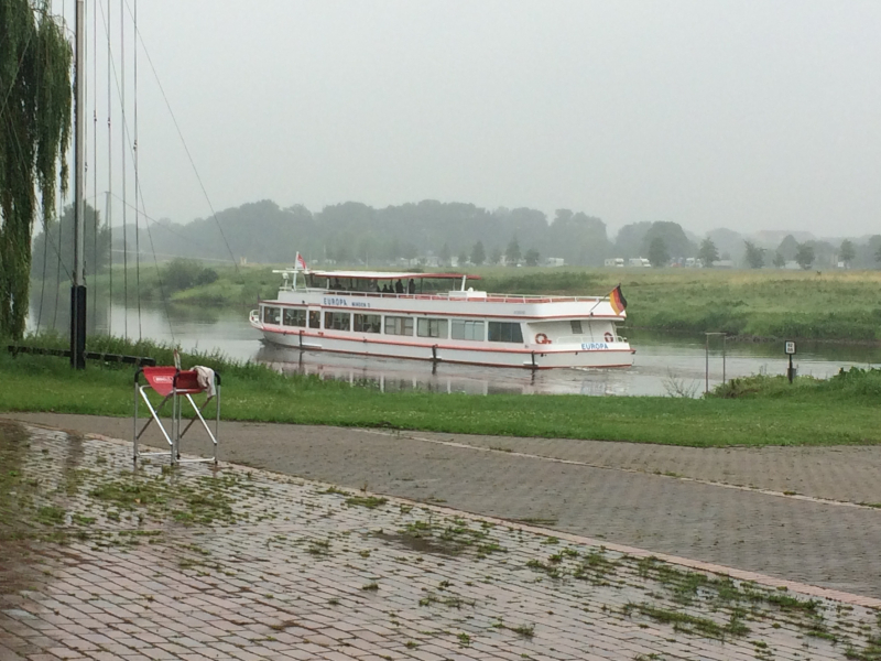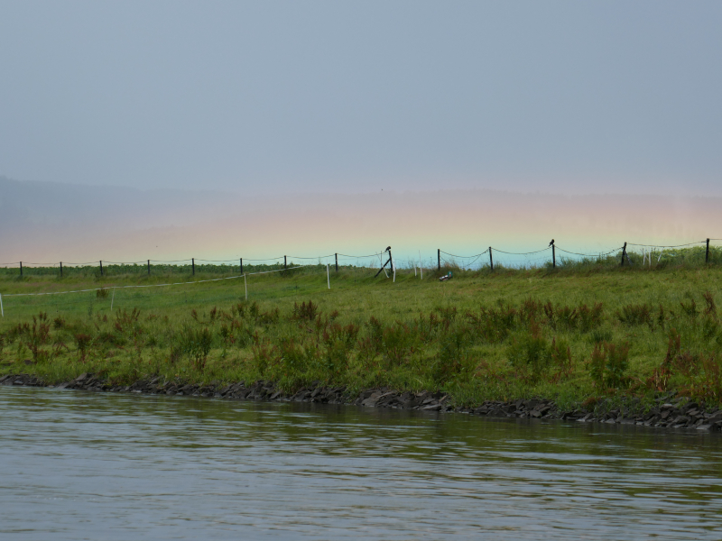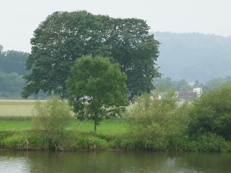 Der große Hunger zum Frühstück am ersten Rudertag verzögerte die Abfahrt etwas. Pünktlich mit der ersten Schleuse öffnete auch der Himmel seine Schleusen. Mittagspause bei einem stattlichen Kloster in Bursfelde. Bei der 2. Etappe regnete es nur leise. Die Sonne schien in eine Nebelwand und ließ diese für einige Minuten in den Farben des Regenbogens erstrahlen. Ein besonderes Erlebnis.