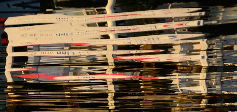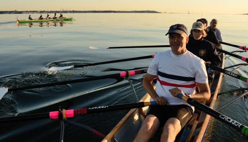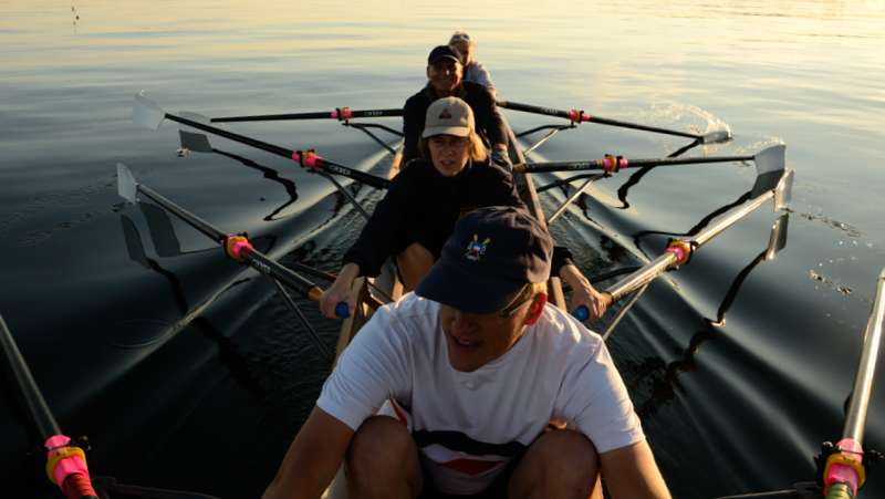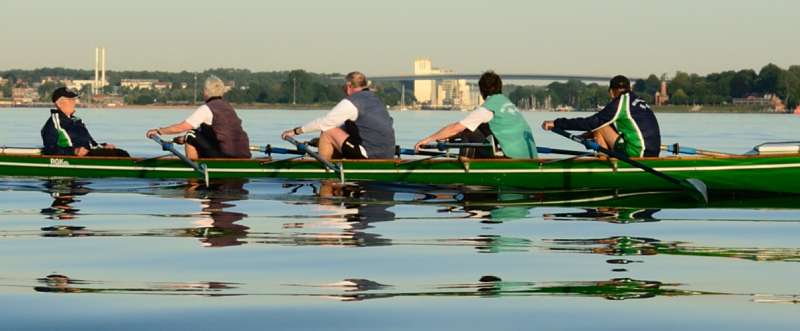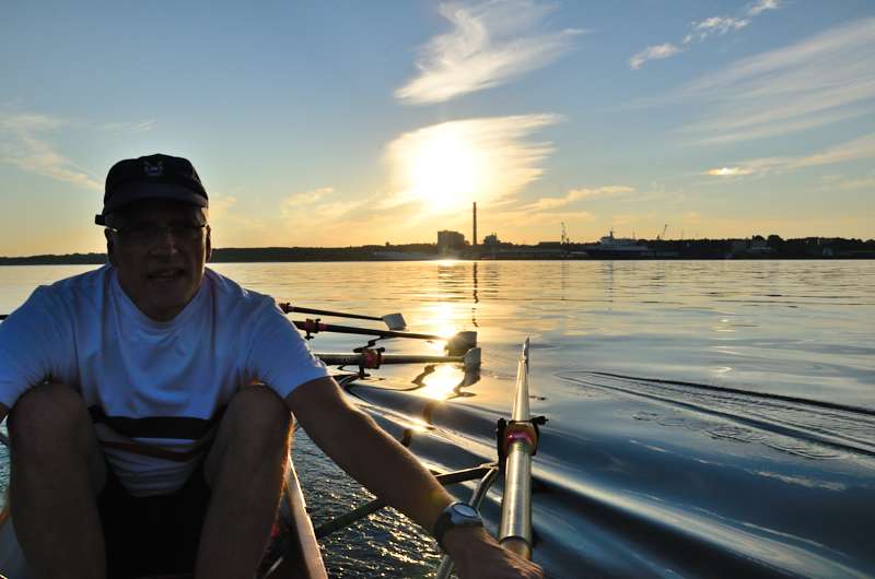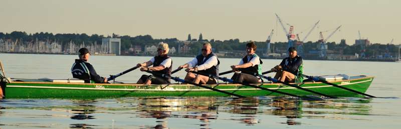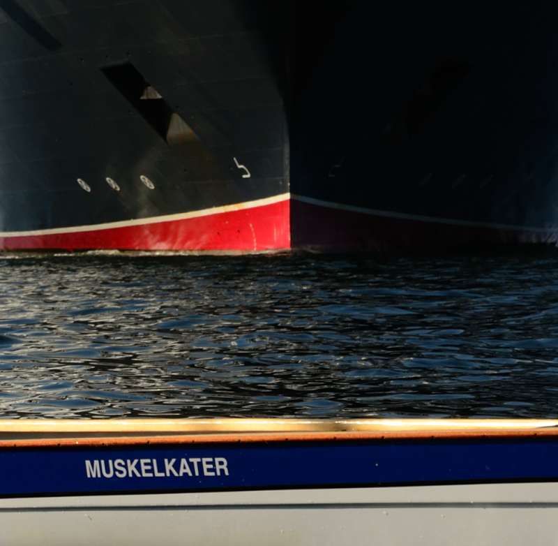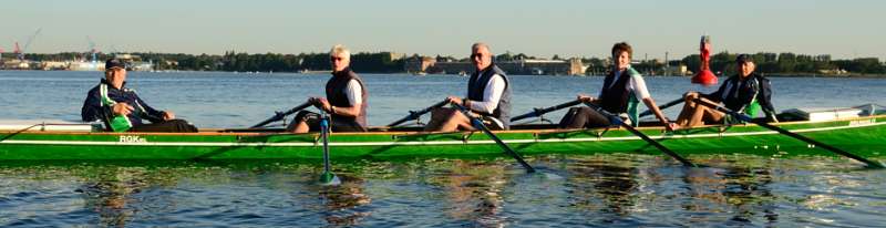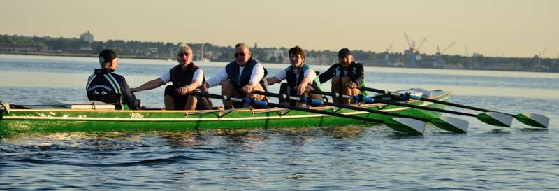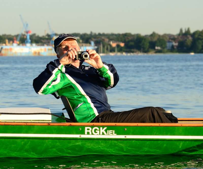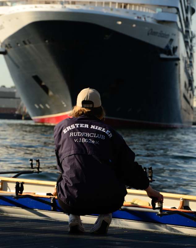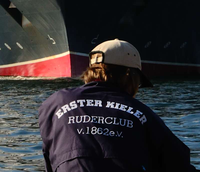 Am Horizont nehmen nun am Horizont in Richtung Kiel-Leuchtturm zwei Schiffe Gestalt an. Leider hat niemand an die Operngläser gedacht und so entbrennen heiße Spekulationen über die Identität der Schiffe: »Das rechte ist die Queen« – »Aber nein, die Queen ist doch blau! Das ist sie Stena!« – »Ist das Linke vielleicht noch ein unangemeldeter Kreuzfahrer?« Erste Wetten werden gestartet, um ein Käsebrötchen beim späteren Frühstück. Auch wenn es schade ist, dass wir so früh umkehren müssen, ein Gutes hat es doch: Während der gesamten Rückfahrt haben die Ruderer, stets rückwärts gewandt, die langsam näher kommenden Schiffe fest im Blick.