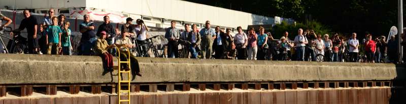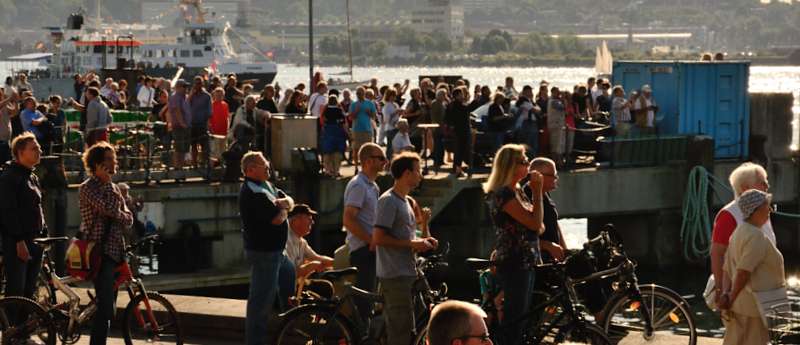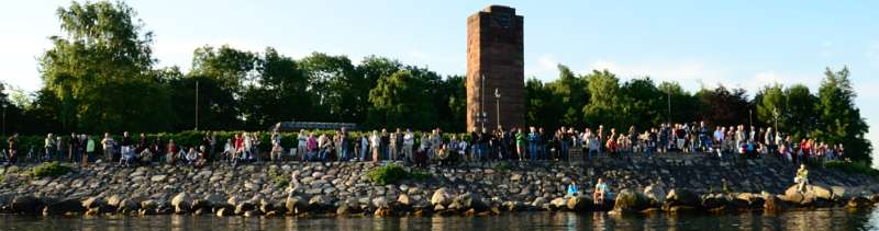 Am »Sockel« in Möltenort (noch immer ohne den Adler) sind die Logenplätze bereits besetzt. Dichte Menschenmassen säumen das Ufer, den Blick starr Richtung Laboe gerichtet, von wo das Schiff schon längst hätte in Erscheinung treten sollen. Doch noch ist nichts zu sehen. Mangels anderer Schiffe machen wir noch ein Gruppenbild mit Germania, und dann geht es noch ein Stück weiter, bevor wir umkehren müssen.