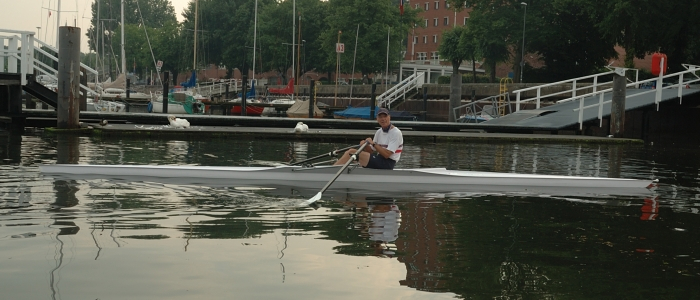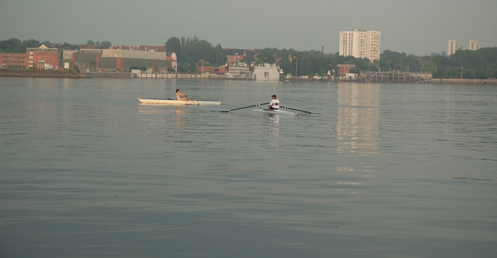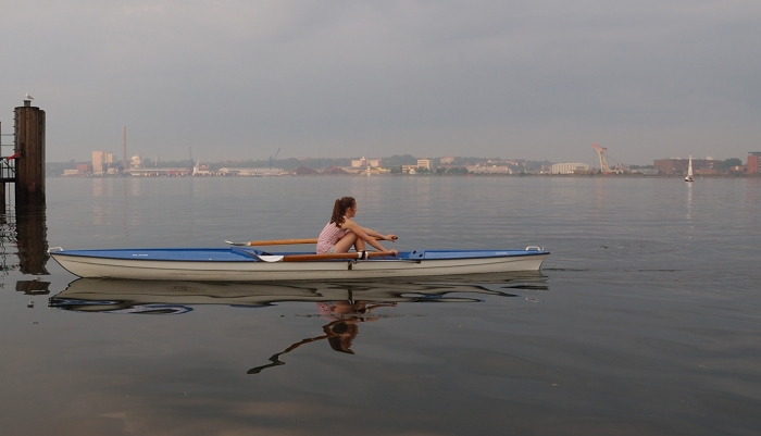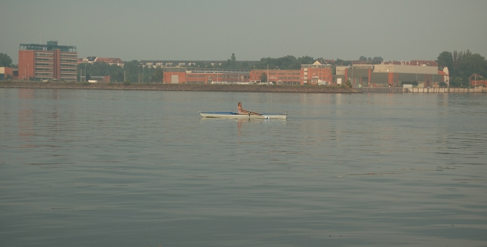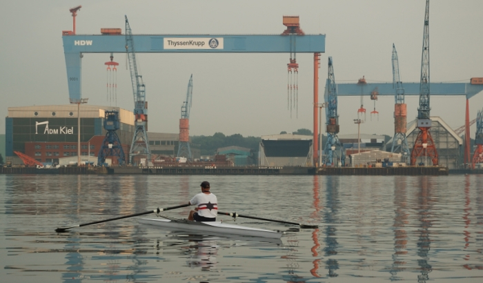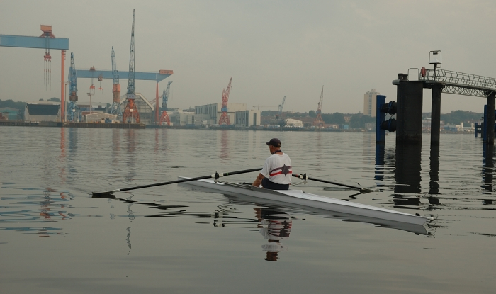 In fünf Einern und einem Zweier präsentiert sich uns schließlich ein Traum von Kieler Förde: Spiegelglattes Wasser, schließlich reißt auch der Himmel auf und die Abendsonne vertreibt die letzten Gedanken an den gewesenen Regen. Richtung Wik ziehen Nebelschwaden über das Wasser. Alle Fördedampfer, Segler oder sonstigen Störenfriede haben sich ihre Nachtruhe angetreten und wir haben die Förde ganz für uns alleine!