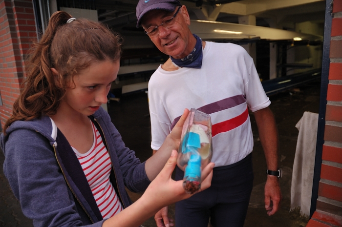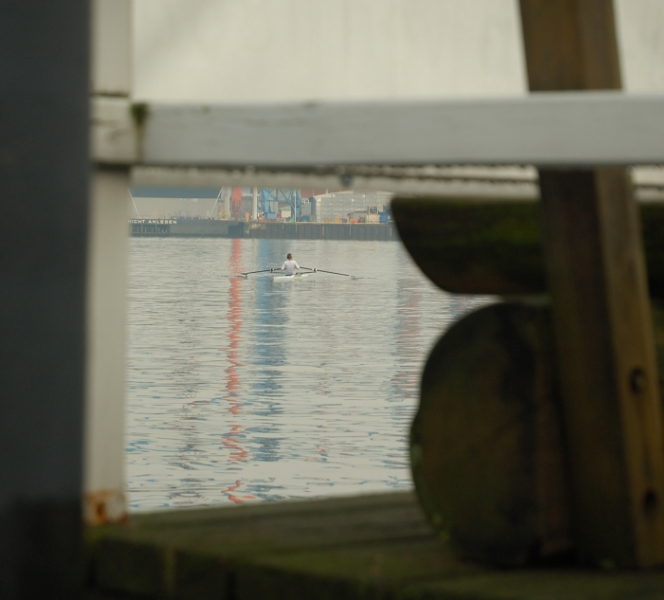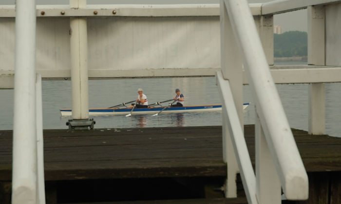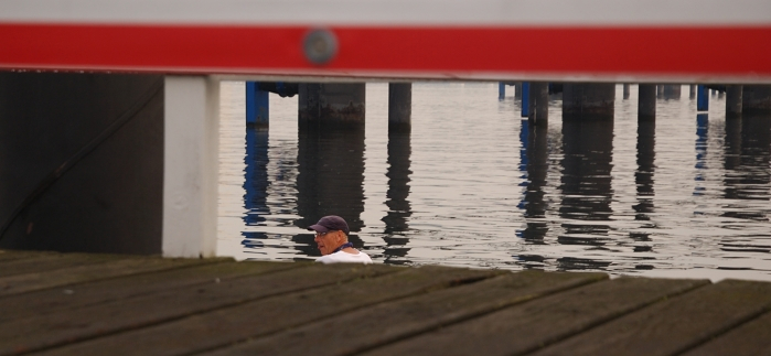 Und so beginnt das zermürbende Warten im Schutz der offenen Bootshaustür. »Eigentlich war nur ein kurzes Schauer angesagt« – doch die Schleusen bleiben geöffnet. Vorsichtige Blicke zum Himmel unter dem Regenschirm heraus bringen keine Lichtblicke zu Tage. Am Steg legen Ruderer des ARV an, klatschnass steigen sie aus ihrem Boot, eimerweise lenzen sie es vor dem Transport zu ihrem Bootshaus. Der Wind schläft völlig ein, das Wasser jetzt ideal – nur leider ist es immer noch nass von oben.
