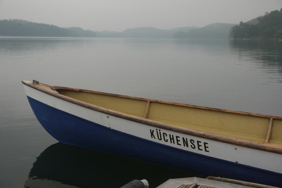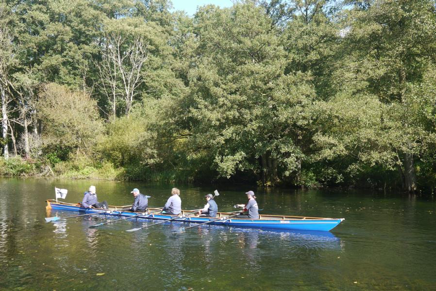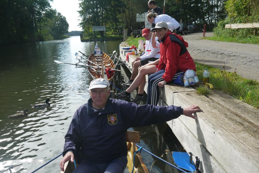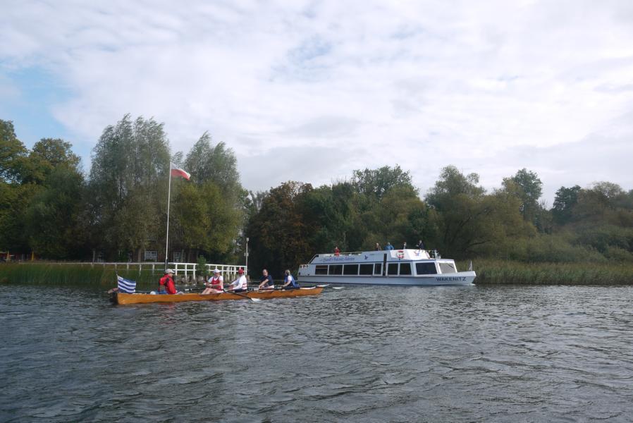Am nächsten Morgen ging es nach wirklich reichhaltigem Frühstück wieder zum Ruderclub zur Entgegennahme der Boote, es waren Regenschauer angekündigt, die ganz dunklen Wolken sind aber glücklicherweise hinter uns abgeregnet. So erreichten wir nach ca. 10 Kilometern fast trocken die Einfahrt in die Wakenitz bei Rothenhusen, hier überholte uns Bernd Pingel in einem roten Vierer seines Lübecker Rudervereins, was für ein Zufall! Weiter ging es noch 5 Kilometer zum Landhaus Absolonshorst, wo 2011 der Wendepunkt unserer Lübeck-Wanderfahrt war, genau wie diesmal, nur von Süden her. Auf dem Rückweg frischte der Wind deutlich auf, die Westseite des Sees bot aber genügend Windschutz. Zurück im Küchensee war noch ein kurzes erfrischendes Bad im See möglich, bevor die Rückreise nach Kiel angetreten werden konnte. 50 Ruderkilometer mal in einem für viele bis dahin noch unbekannten Revier bei herrlichem Spätsommerwetter erfreuten Andrea, Armin, Cristine, Hanno, Heinz, Helga, Jens (Pau), Volker und
