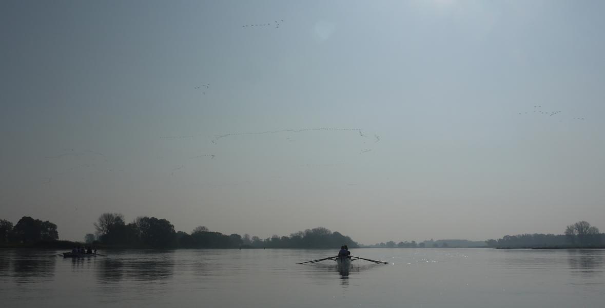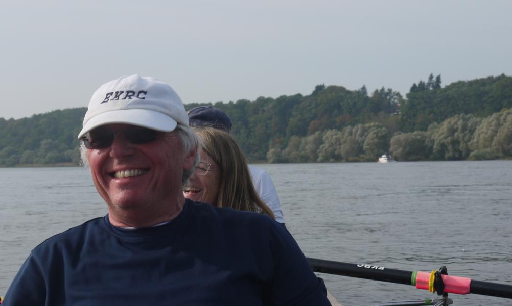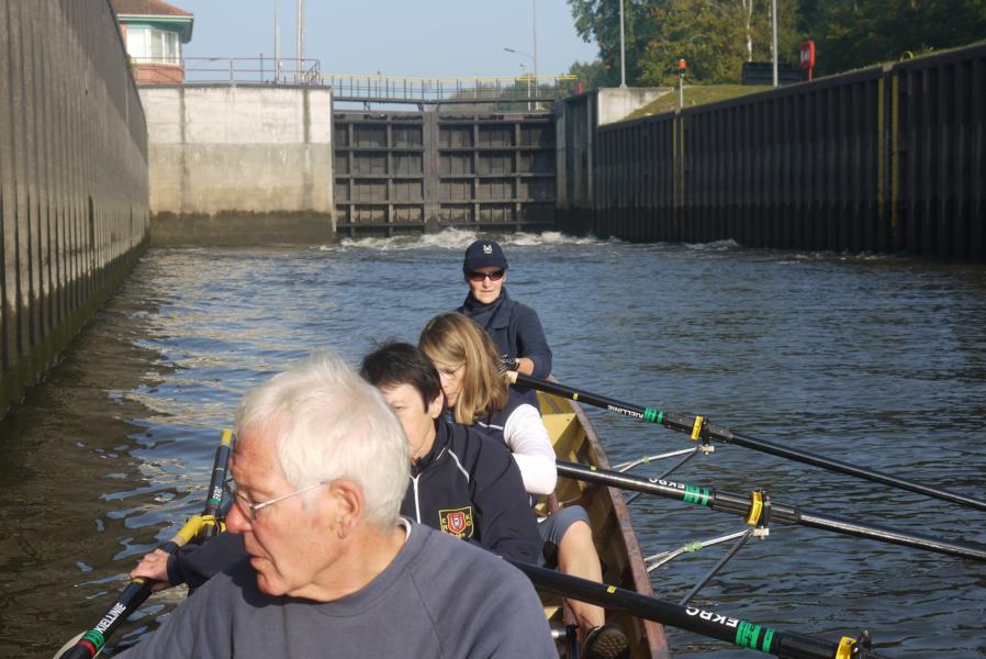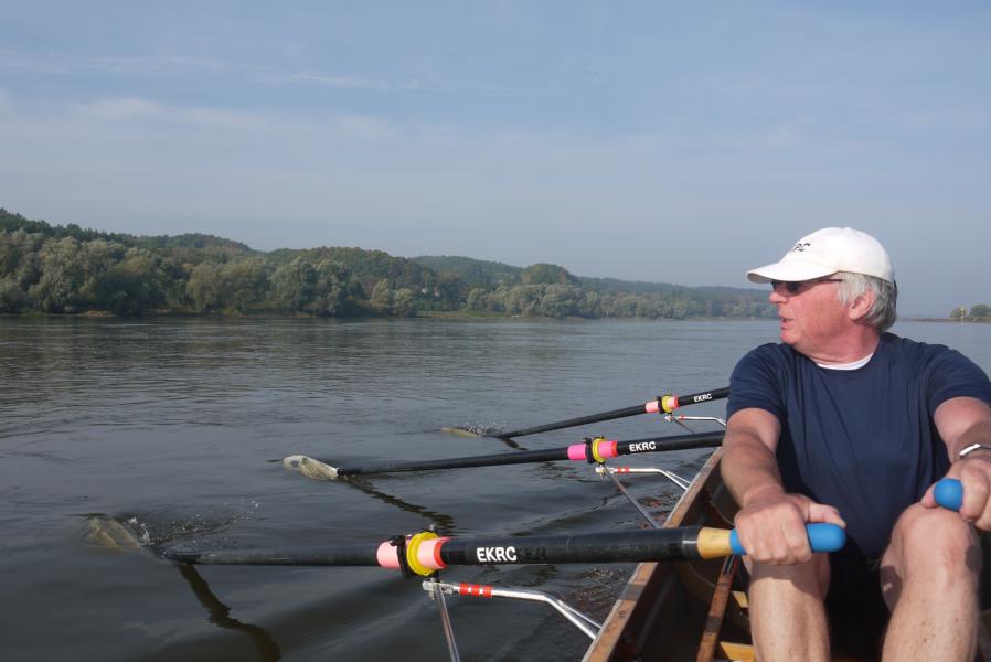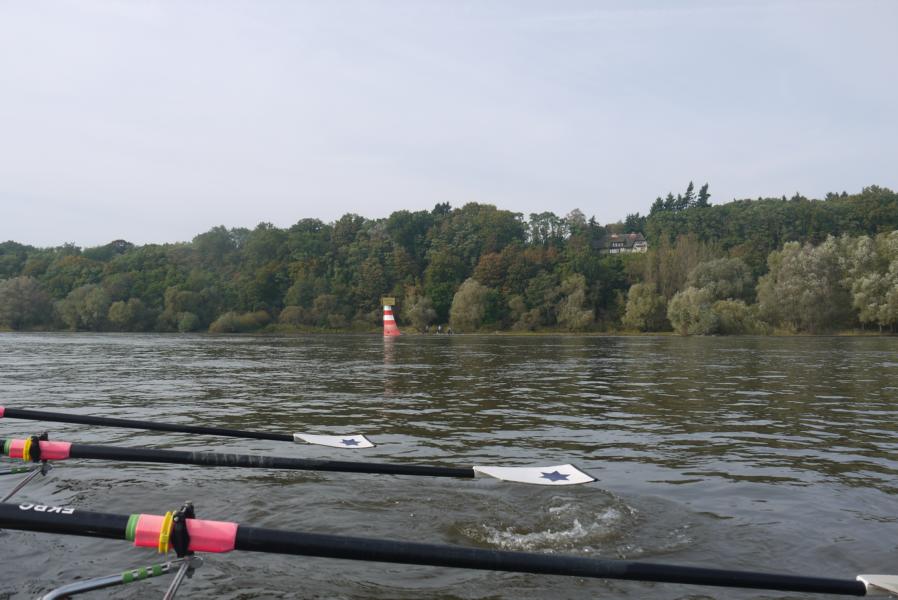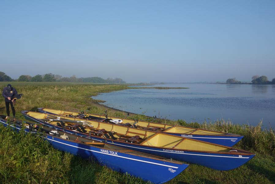 Am letzten Tag ging es weiter elbabwärts vorbei am Kniepenberg, er misst 86 m ü. NN und ein hoher Aussichtsturm bietet hier wieder einen Panoramablick über die Elbtalniederung. Insgesamt war die Landschaft im Vergleich zu den Vortagen durch die ausgeprägten Höhenzüge deutlich vielfältiger. Beim Rudern ging dann zeitweise schon etwas träger als an den Vortagen zu, für Lacher sorgte aber nicht nur die Frage des auf seine Füße starrenden Steuermannes Paul „Hat jemand zufällig eine Nagelschere dabei?“, sondern erst recht die Antwort der stets gut organisierten Cristina „Ja, ich habe eine!“. Hanno, Landdienst des Morgens, erwartete uns an einem idyllisch gelegenen Sandstrand. Von hier ging es schließlich weiter bis Lauenburg, unserem Ziel im 5. Bundesland des Wochenendes, Schleswig-Holstein. Die Stadt erwartete uns bei Kilometer 570 mit ihrem malerischen Altstadtpanorama, das zu genießen allerdings wenig Zeit ließ, denn die Strömung der Elbe und die vielen Freizeitkapitäne verlangten hohe Konzentration. Das anschließende Abriggern und Aufladen der Boote war ausgesprochen routiniert, auch die steile Bergpassage mit Bootshänger vom Gelände der RG Lauenburg hat Michael dann noch brillant gemeistert. Kurzum, lieber Michael für Deinen Einsatz für Planung und Durchführung einer 100%ig gelungenen Ruderwanderfahrt danken Dir