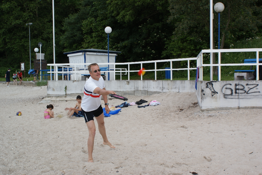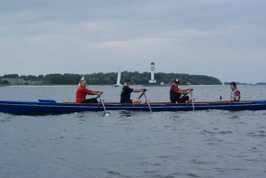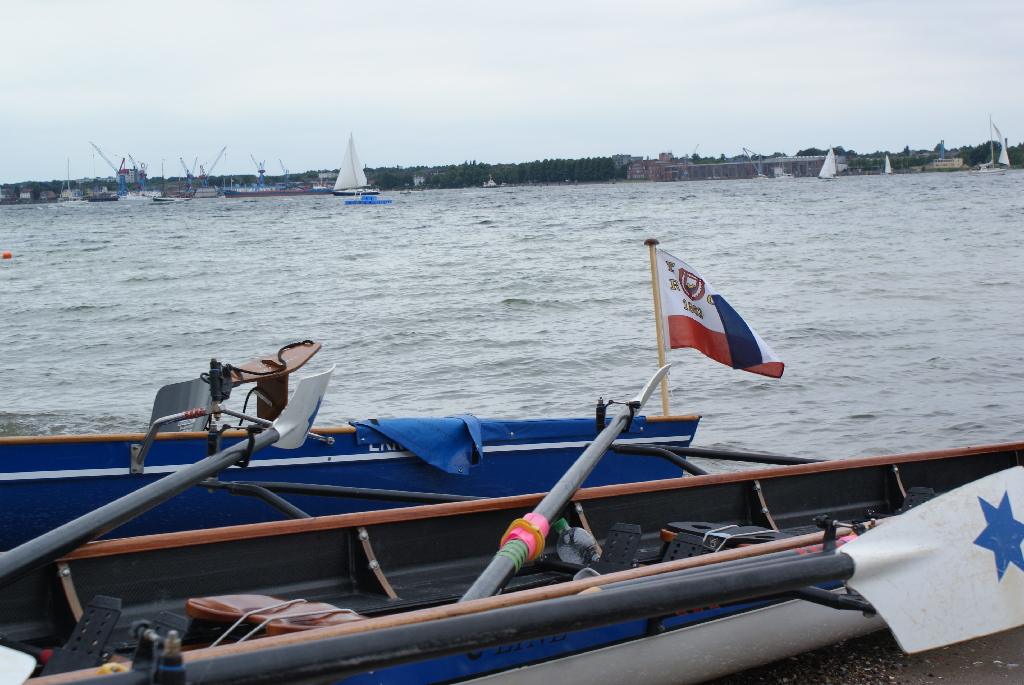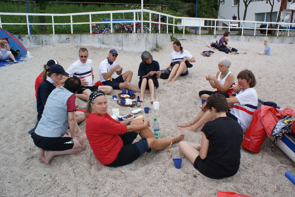 Nach Ostern und dem 1. Mai hieß es am Pfingstmontag wieder auf zum Feiertagsrudern. Mit 12 Leuten und den Booten »Adler«, »Hans Tolk« und »Schulensee« brachen wir dieses Mal auf zum Strand – gleich hinter dem »Adler« am U-Boot-Ehrenmal in Möltenort. Bei mäßigen bis frischen Winden aus Südwest und freundlichem Wetter waren wir auch schnell am Ziel. Die längere und angenehme Pause am Strand verbrachten wir mit Kaffee und Kuchen sowie einigen Spielen. Wir haben auch feststellen können, wie sich Salzwasser und auch Sonnencreme auf die Funktionsfähigkeit auf Mobiltelefone auswirken kann.