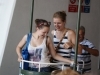 Von der Lombardei rudern wir auf die westliche Uferseite ins Piemont nach Pallanza. Immerhin mit 25 Kilometern die längste Etappe. Das Serviceteam kann mit dem Bus die Fähre von Laveno nach Intra nehmen. Mit unterschiedlichsten Sprachfetzen aus Deutsch, Englisch, Italienisch und Französisch ist es ihnen gelungen, uns telefonisch beim Ruderverein in Pallanza anzukündigen. Wir wurden sehr gastfreundlich empfangen. Das einfache Bootshaus war nun unser Quartier für die nächsten drei Nächte. Am nächsten Tag besuchte uns der Presidente des Rudervereins und machte uns ein schönes Gastgeschenk. Er überreichte uns einen Bildband vom Lago Maggiore. Leider konnten wir ihn kaum verstehen. Wir revanchierten uns mit einigen Flaschen Wein und einer EKRC-Bootsflagge samt Stock. Das Bootshaus durften wir kostenfrei benutzen. Wir haben es dafür auch besonders sauber hinterlassen. Doch vorher wanderten wir noch auf den Monte Sasso del Ferro, dem 1062 Meter hohen Hausberg von Laveno. Also ab auf die Fähre über den See und aufs Plateu Poggio Sant’Elsa in 972 Meter Höhe wandern. Der See liegt bei 193 Metern, somit galt es, knapp 800 Höhenmeter zu überwinden. Die ersten waren nach einer Stunde durch Wald und über Wiesen auf recht steilen Wegen und Treppen oben. Nach zweieinhalb Stunden haben es alle geschafft. Der prächtige Ausblick auf den See und die Alpen sollte dafür entschädigen. Einige sind noch ganz auf den Gipfel gestiegen. Mit den originellen offenen Seilbahngondeln, die nur zwei Personen Platz bieten, ging es umso bequemer wieder herunter. Auf dem Rückweg machten wir einen Stopp in einer Eisdiele in Pallanza, die einige bereits am Vortag entdeckt haben. Das Eis schmeckte sehr gut. Am letzten Tag in Pallanza war wieder Rudern angesagt rund um die Borromäischen Inseln, einer Gruppe von vier Inseln im Golf von Verbania. Die Mannschaften samt Kielschweinen teilten Max und ich ein und bekamen dieses Mal Namen: The Twins Boat (mit Anne und Luise sowie Bruno und Konrad), The Pink Divas (in Anspielung auf die farbigen Tour-Shirts der Mädchen), The Fat Eagles (die etwas kräftigeren Jungs im »Adler«) und The Chaos Boat (wie sind wir nur darauf gekommen …).
